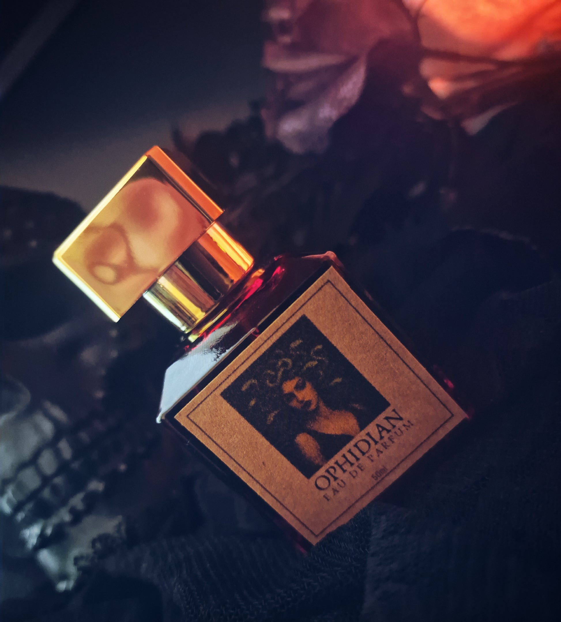 A fragrance that moves like silk over skin, coiling close with an intoxicating pull. At first breath, a luminous shimmer of orange blossom unfurls, its golden light laced with the heady, narcotic bloom of jasmine and the powdery elegance of iris. Then, a sudden, irresistible bite Of blackcurrant and pear, sweet yet dangerous, like fruit offered in a forbidden garden. Beneath, shadows deepen. Patchouli winds through the air in dark, earthy swirls, entwining with the molten richness of vanilla and the decadent sweetness of praline. Together, they create a lingering heat that clings to the senses, both comforting and perilous. Ophidian is not worn, it possesse